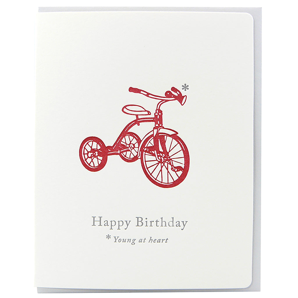 • "Happy Birthday" and " * Young at heart" printed on the front in matte silver ink, typeset the old-fashioned letterpress way with moveable metal type!