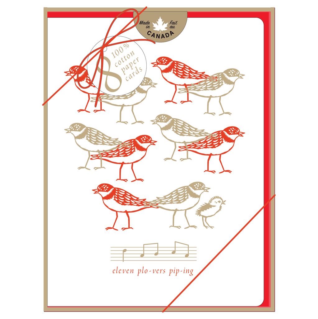 - "eleven plovers piping" printed on the front in red ink with matte gold music score
